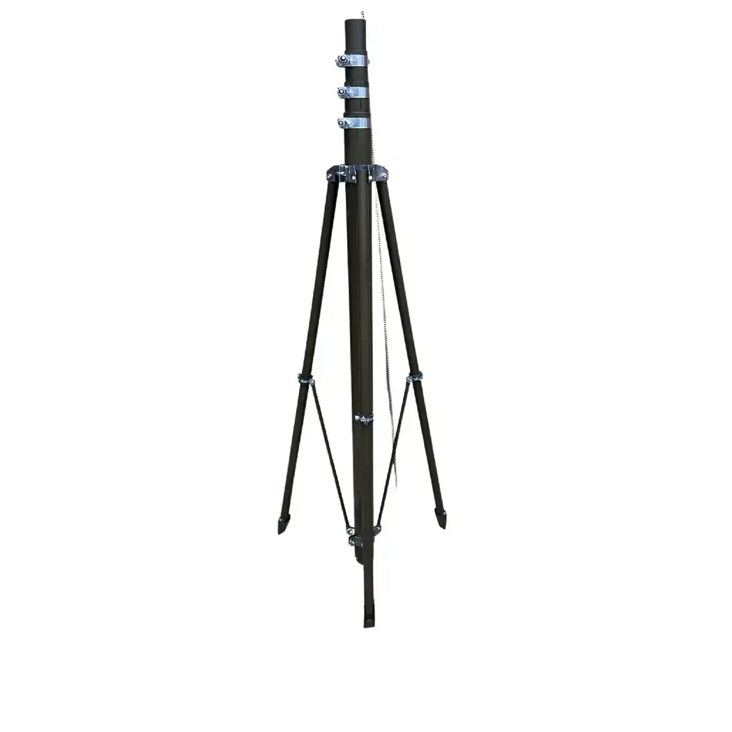 Compact aluminum telescopic mast, 4 sections. Weight – 8.3kg Folded – 1.6m Has stakes for better stability and steadiness. Powder coating. At the end, it has a perforated plate for installing antennas/mounts. If necessary – can be equipped with 3D printed antenna mounts. For wholesale orders, we can make changes to the design or make from scratch according to your needs.