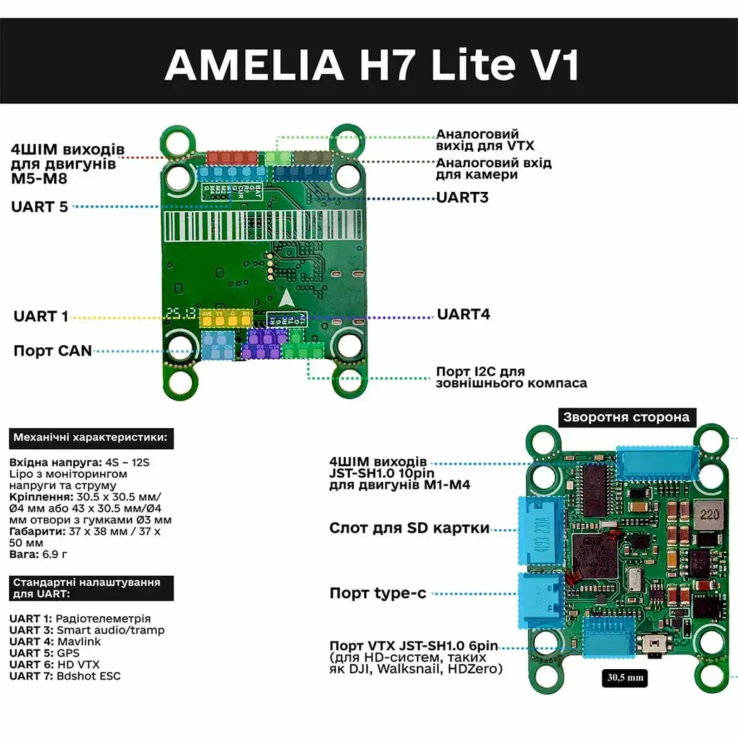 The Amelia FC H7-Lite flight controller is packed with many features, including up to 12S voltage input support, a powerful microprocessor, a quality barometer and accelerometer, OSD, CAN, I2C, 6x UART, a mini MicroSD card slot, 5V/2A and 12V/3A BEC, and much more. The flight controller is designed to work with HD video transmitters, DJI, Walksnail, HDZero, OpenIPC while simultaneously supporting analog VTX systems. It has 6 dedicated UART ports with built-in inversion for peripherals (UART4 with FlowControl RTS/CTS support), as well as a mini MicroSD card slot for executing scripts and virtually unlimited Blackbox data logging. 8 PWM outputs with DSHOT, MultiShot/OneShot/Proshot/PWM, etc. support. Compatible with Ardupilot, iNav, Betaflight, RotorFlight software.