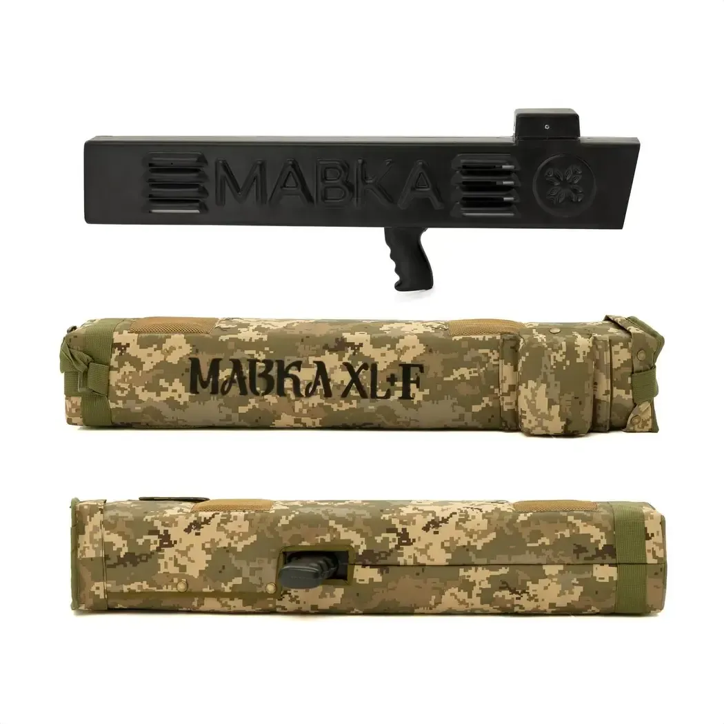 Anti-drone rifle “Mavka XL+F” – a means of directed electronic warfare. Unlike the previous model, it has a wider range of FPV drone control frequency suppression. 2.4/5.8/700-950 frequencies. 20 watts per channel/80 watts total. Antennas directed at +-20° angle. Operating range up to 1 km (Mavic) 50-300 m FPV (provided the drone operator is at a distance of about 3 km), continuous operation time about 45 min, weight 6.5 kg, replaceable battery compartment, cover. As an additional option – bag + 4 batteries