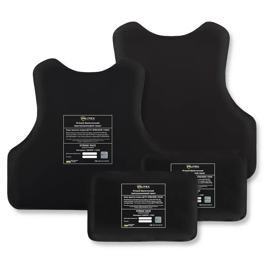 Militex ballistic packages (protection class 2) — soft and light UHMWPE panels that reliably stop pistol bullets, shrapnel, and secondary fragments.