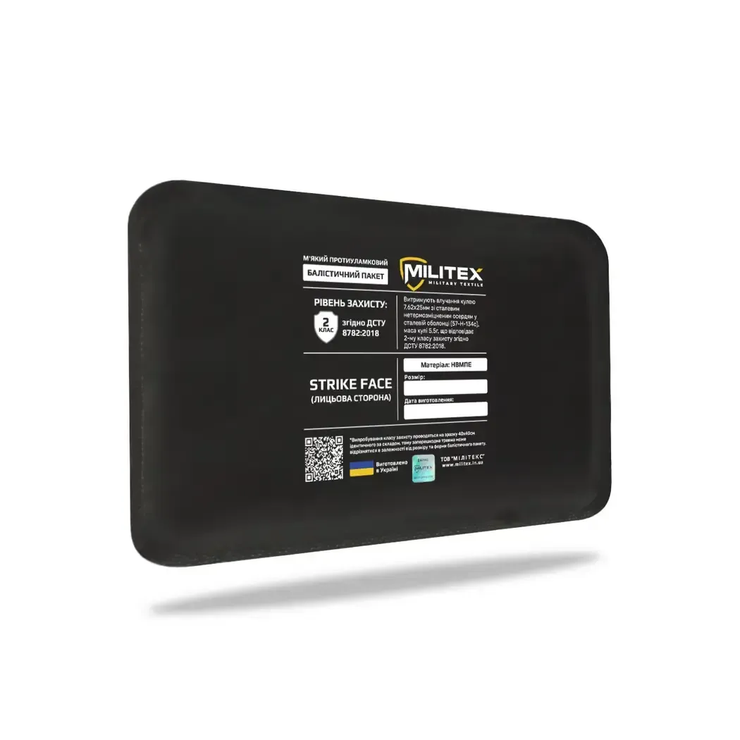 Militex ballistic packages (protection class 2) are soft, light, and flexible panels that provide protection against pistol bullets, fragments, and secondary damaging elements.