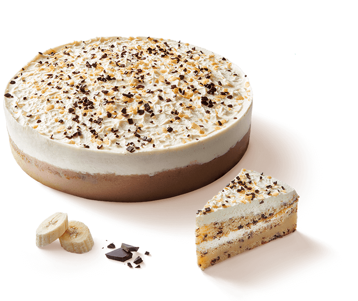 This exquisite dessert is a towering creation, featuring three delicate layers of light sponge cake, each generously studded with rich chocolate pieces. Between these airy layers, you’ll discover a luscious banana cream, perfectly complemented by a vibrant banana jelly, offering a delightful burst of fruity sweetness in every bite.