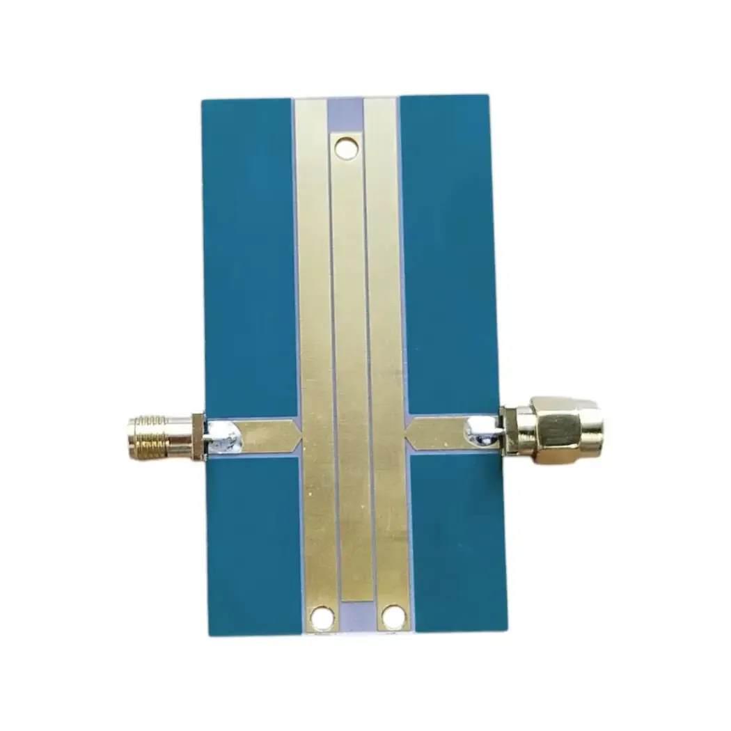 Feature – low losses at the fundamental frequency, increased suppression at other frequencies. Band-pass microstrip filter on high-frequency PCB. We can manufacture filters for custom frequencies.