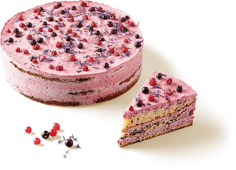 Excellent berry red cake with great flavor and quality. Stracciatella base, fruity cream, fruit pieces.
