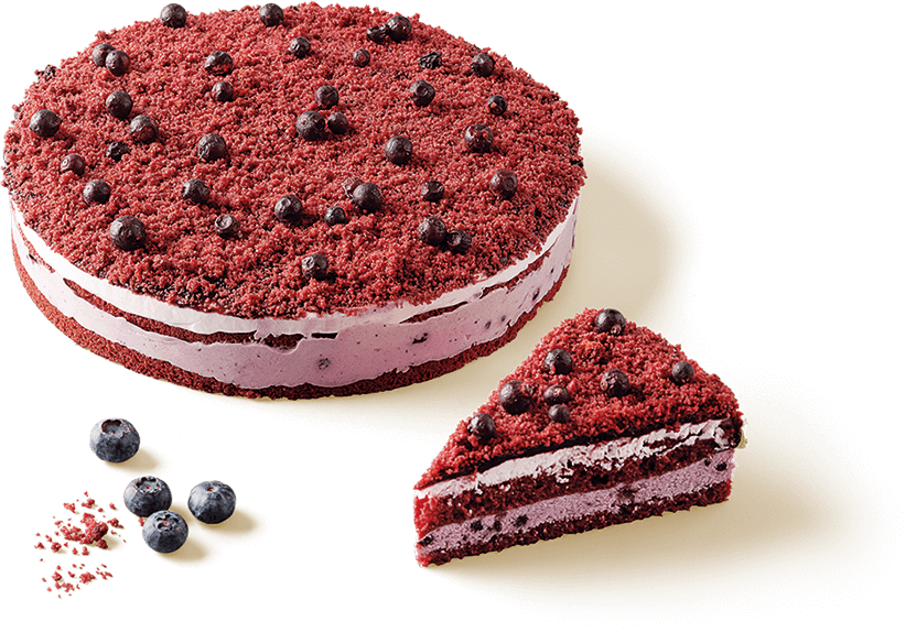 A delightful dessert featuring a rich red velvet cake base, complemented by a smooth and creamy filling, and enhanced with a burst of fresh blueberries. The creamy filling often incorporates cream cheese, sugar, and sometimes marshmallow cream or butter, creating a luscious contrast to the tangy fruit.