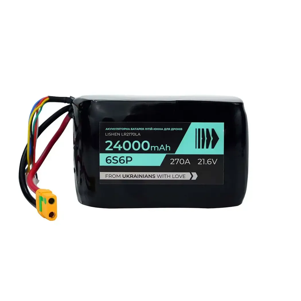 Lithium-ion battery BTRY 6s6p Lishen LR2170LA – one of the best solutions for use with Leleka UAV. The battery has: a large battery capacity, the total power of the elements is 24000 mAh, high voltage, 21.6 V – this is the output voltage of serially connected elements, and reliability, with parallel connection, if one or more elements fail, it will not significantly affect the overall operation of the device, there will always be an opportunity to complete a critical task. It has an AWG 10 power cable and an XT-90 power connector