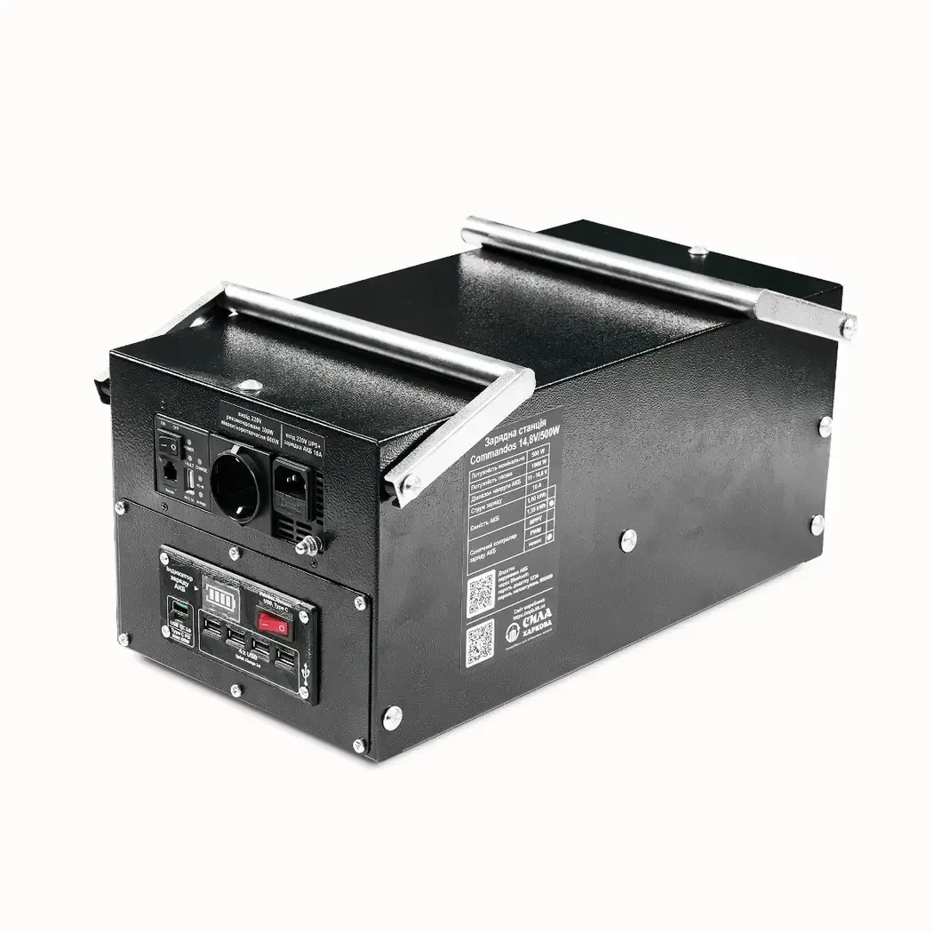 The “Commandos 14.8V/500W/1.35kWh” model is equipped with a powerful 14.8V battery with a capacity of 1.35 kWh and a 500W inverter with a built-in charger. This combination ensures reliable autonomous 220V power anywhere, anytime it is needed. This is especially important in combat zones! Our portable charging stations are already helping our defenders in the combat zone when using the Starlink system (autonomous operation of satellite internet is provided for 12-13 hours), allowing servicemen to charge all necessary gadgets directly on the battlefield, including radios, thermal imagers, drone batteries, sights, tablets, phones and many other devices.