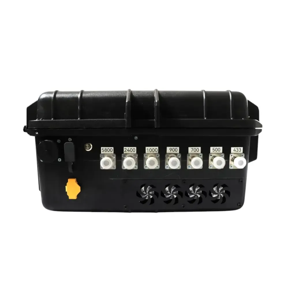 Trench (vehicle-mounted) electronic warfare (EW) system, an innovative complex with the highest level of protection against UAVs, including multi-channel suppression, as well as protection against drops. It covers a band in the range (400-1200MHz, 2390-2500MHz, 5725-5850MHz). The device’s continuous operation time is 30-60 minutes. It works from a built-in battery and from a car.
