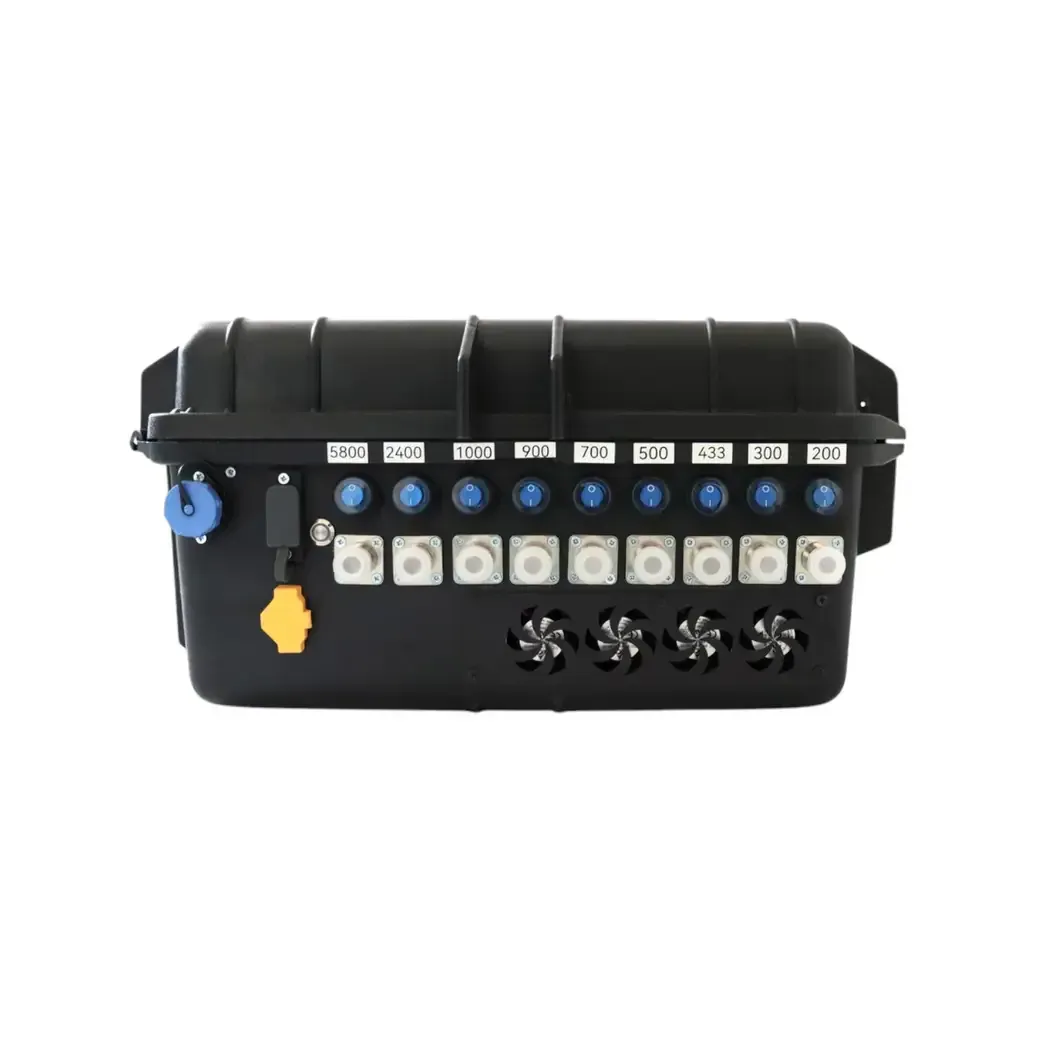 Trench (automotive) electronic warfare (EW) system with the highest level of protection against UAVs, including multi-channel suppression, as well as protection against drops. Covers a band in the range (200-1200MHz, 2390-2500MHz, 5725-5850MHz). Continuous operation time of the device – up to 60 minutes. Powered by a built-in battery and from a car.