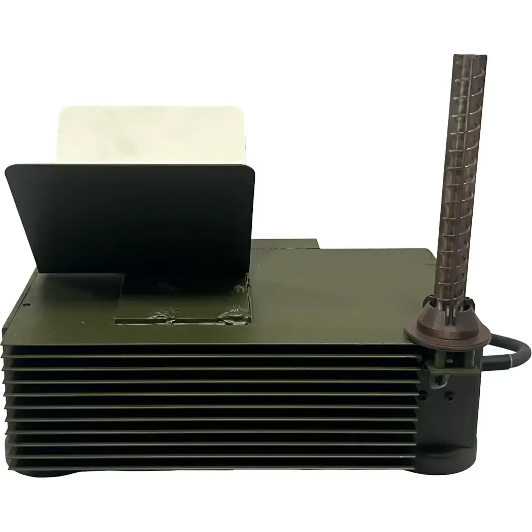 The device comes with magnets, which allows it to be quickly attached to the roof of a vehicle. The device also has a remote control with an indication of the EW system’s operation. The device’s antennas have a directional angle of 40-65 degrees, which at height creates a space where drones lose control, preventing them from dropping on the vehicle or position. The main advantage of the Otaman 3 EW system is the use of proprietary antennas with a gain coefficient of at least 14 dBi in the 2.3-2.5 GHz range and 15 dBi in the 5.5-6.2 GHz range. This allows the use of low-power interference amplifiers to achieve results, as well as long battery life and small overall dimensions. During tests at the training ground, it suppressed a Mavic 3T at a distance of 500 meters directionally, and during the second test at a height of 300 meters when the Mavic was approaching for a drop. Test conditions: Pilot at a distance of 3 km. The pilot used Alientech 10 watts and a directional Yagi 12 dbi. Direct visibility. Without Alientech, the Mavic was suppressed at a distance of 1400 – 1800 meters. PRODUCT SPECIFICATIONS Total output power – 70 W. Power source – 10-28 volts. Or from 220 volts with a power supply unit (optional). Power consumption – 170 watts (real-time device operation tracking capability). Protection against polarity reversal. Device cooling system: passive cooling. The EW system’s body is moisture-resistant and has passive cooling, which allows it to be used in the rain. PACKAGE CONTENTS: EW device – 1 pc. Antennas – 3 pcs. Control panel and connection wires – 1 pc. Battery – optional.