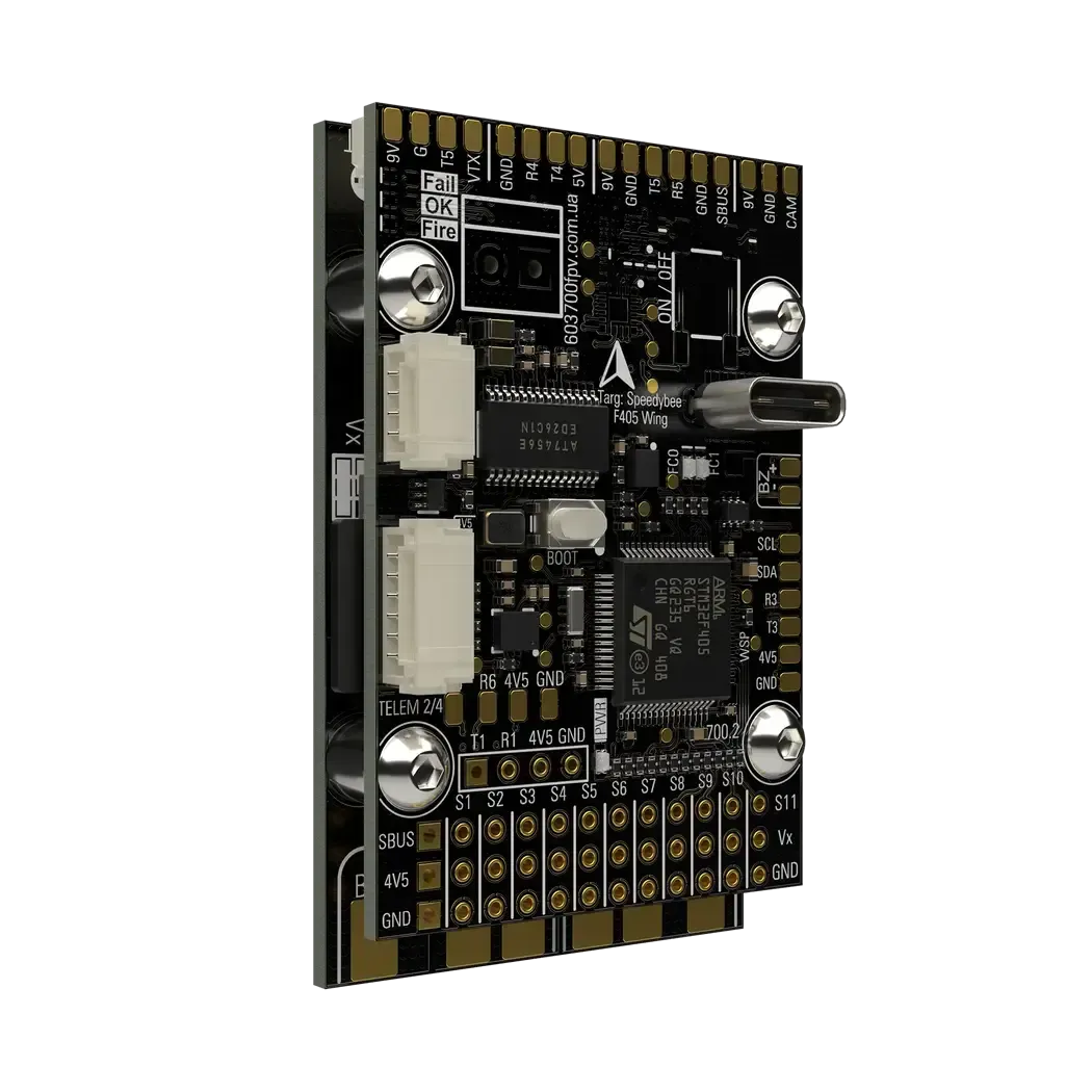 Flight controller for “Boryspil v1” wings. Features: convenient assembly (pins soldered directly to the board), external buzzer, USB on the FC board, powerful BECs with voltage selection, 2 battery connection contacts and Servo1 duplication on the PDB board.