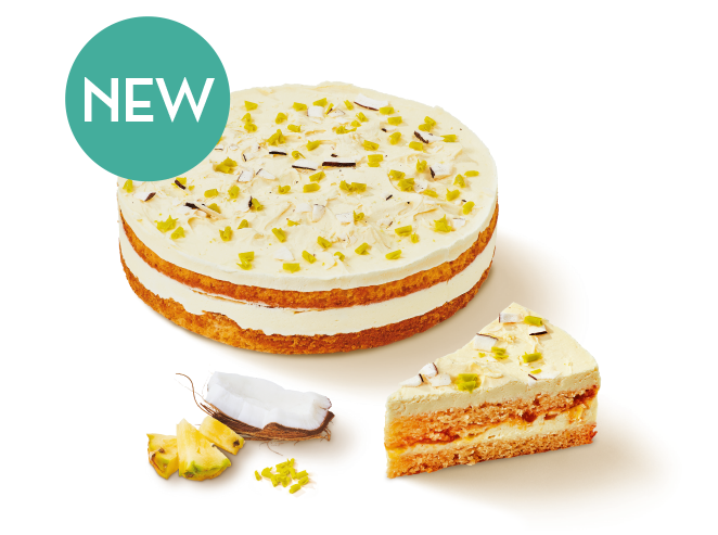 Two layers of coconut base, pineapple cream, green chocolate shavings and coconut slices.