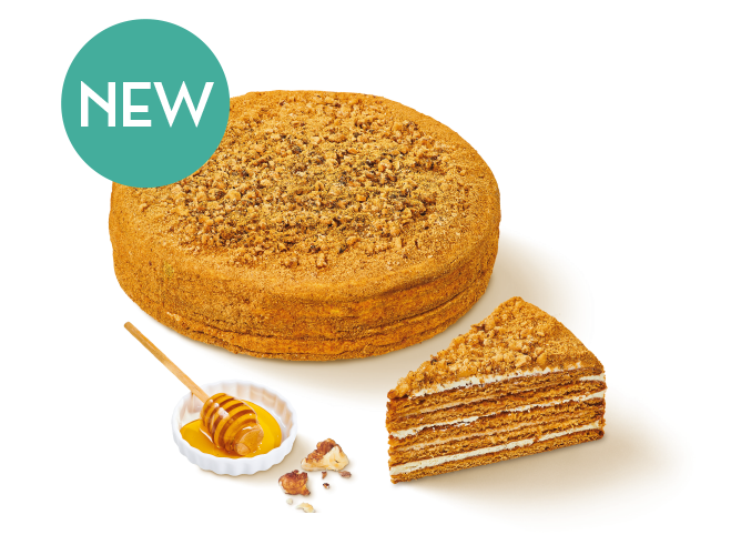 Excellent honey cake with great flavor and quality. Honey base, cream, walnuts.