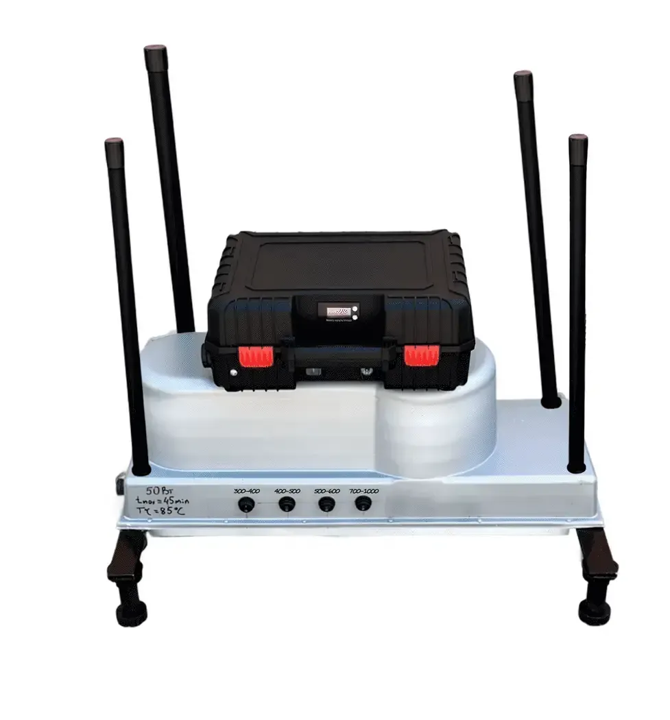 Horten-4.1 counteraction system for 4 modules. The customer can choose frequencies from 100 to 6000 MHz. The system has its own power supply for 60 Amp-hours (approximately 2 hours of continuous operation). Each module has a thermal relay that automatically turns off the module after heating to 85℃, and after a pause (approximately 5 minutes), it turns on by itself. All modules are equipped with a circulator.