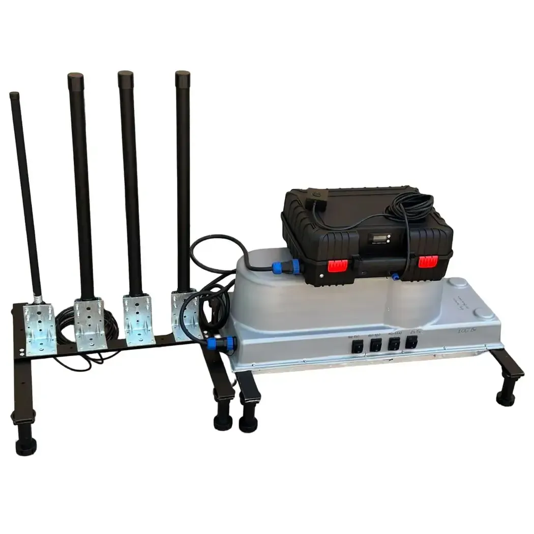 Horten-4 countermeasures system with 4 modules. The customer can choose frequencies from 100 to 6000 MHz. The system has its own power supply for 60 A-hours (approximately 2 hours of continuous operation). Each module has a thermal relay, which automatically turns off the module after heating to 85℃, and after a pause (approximately 5 minutes), turns on independently. All modules are equipped with a circulator.