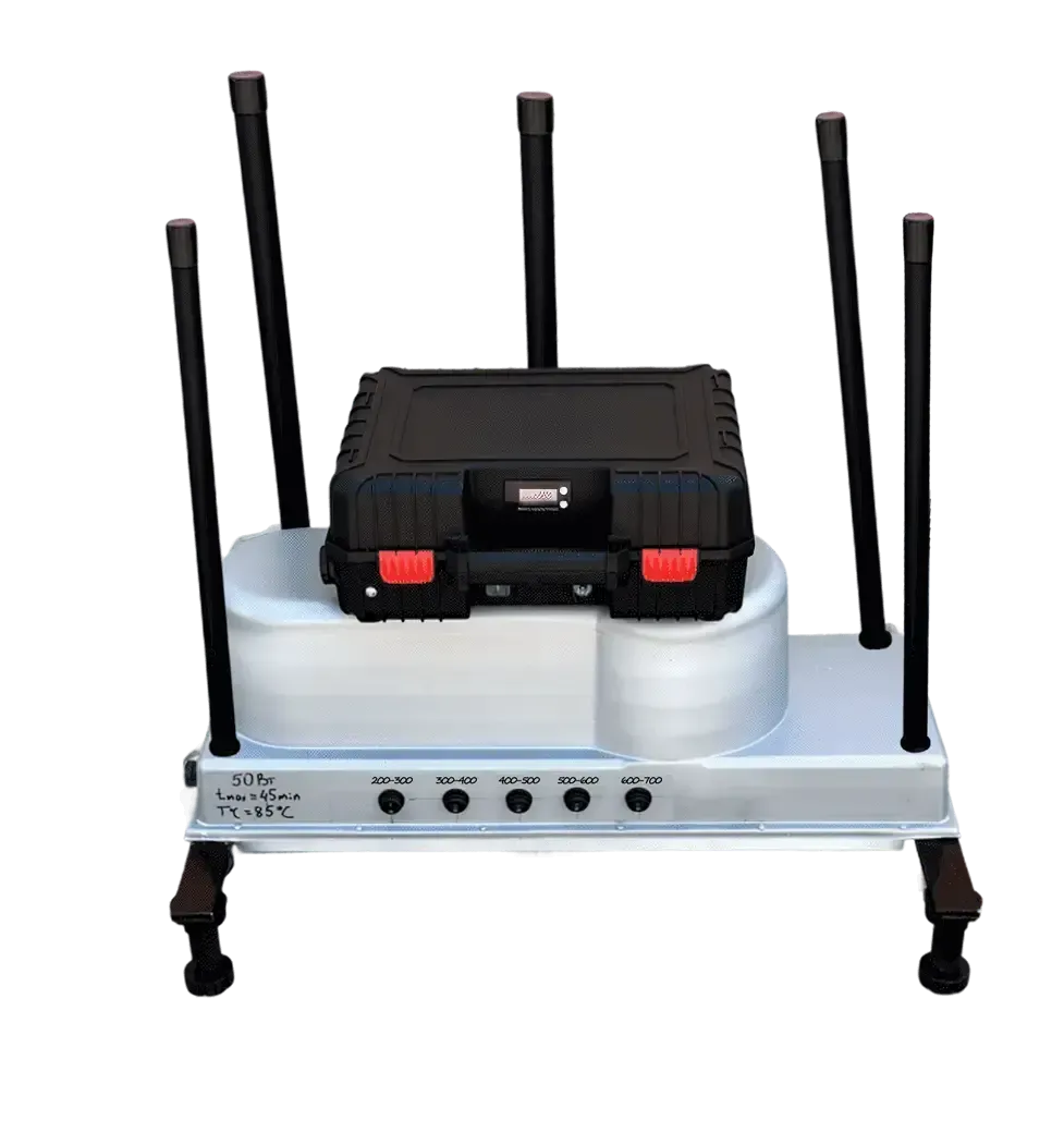Horten-5 counteraction system with 5 modules of 50 watts each. The customer can choose frequencies from 100 to 6000 MHz. The system has its own power supply for 60 amp-hours (approximately 1.5 hours of continuous operation). Each module has a thermal relay that automatically turns off the module after heating to 85°C, and after a pause (approximately 5 minutes), it turns on by itself. All modules are equipped with a circulator.