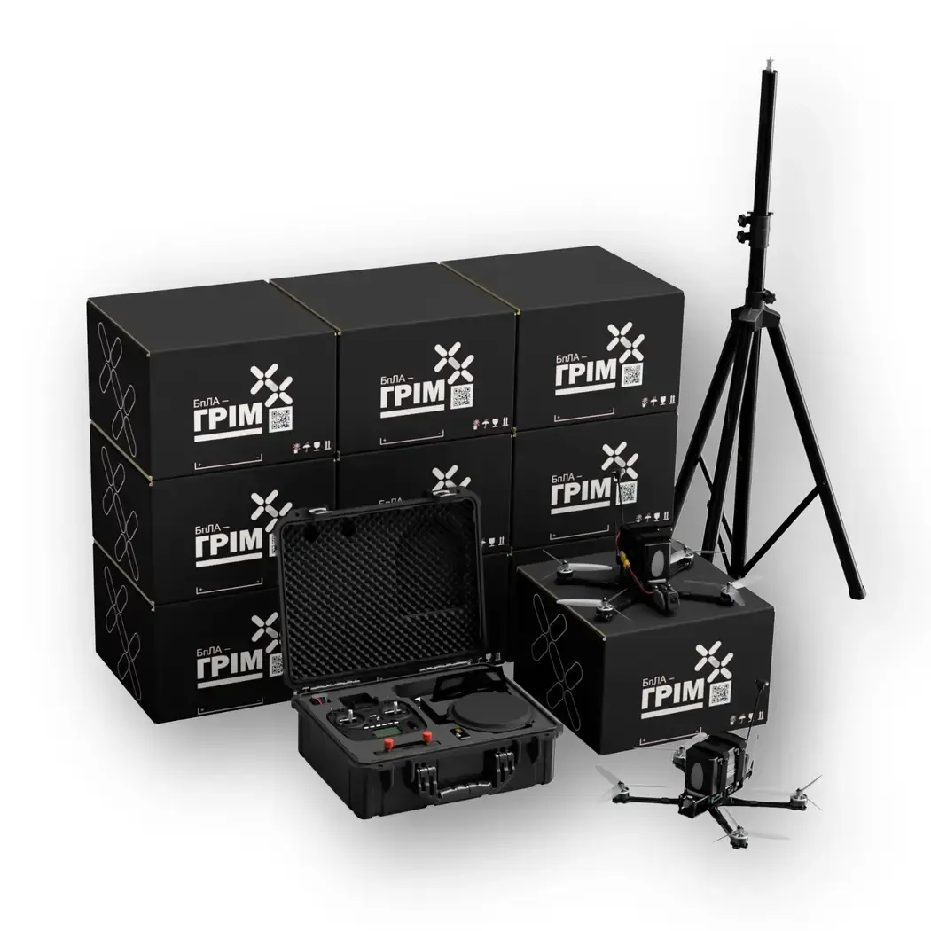 The “HROM 1.3A” unmanned aerial complex is a modern complex that includes a precise and maneuverable FPV kamikaze drone with a durable 8-inch carbon frame of its own production and an analog twilight course camera. The “HROM 1.3A” UAV is designed to defeat enemy manpower and armored vehicles, as well as to deliver combat or logistical cargo to the combat zone. The complex includes: • 50 FPV quadcopter-type drones with vertical launch; • Ground control station with full telemetry and analog video communication in the 1.3 GHz range.