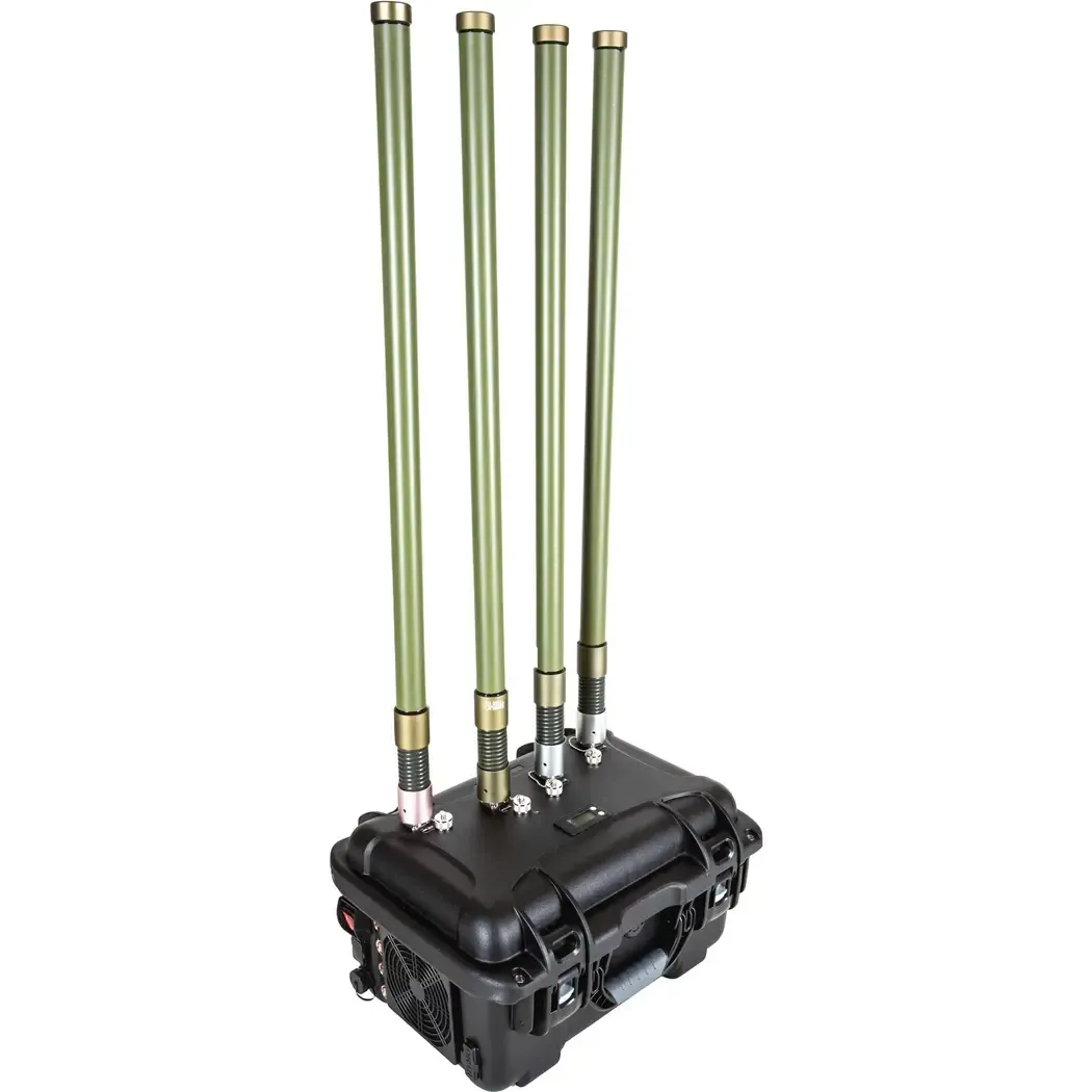 • The device is powered by a built-in Li-ion 45 Amp-hour battery. • Allows continuous operation for about 120 minutes, due to protection against loss of battery voltage during discharge and active system cooling. • The device is equipped with omnidirectional antennas. • The readiness time of the complex for operation (when deployed on the ground without removing antennas and control panel) is 200 s. • Number of independent channels – 4 • Indication – presence of light indication of control elements (LED charging indicator, backlight of channel start buttons). • The weight of the signal generation unit is no more than 16 kg. • Device dimensions: 430 *320 *260 mm. • The degree of product protection is IP55 according to DSTU ES 60529:2019. • Active cooling system.