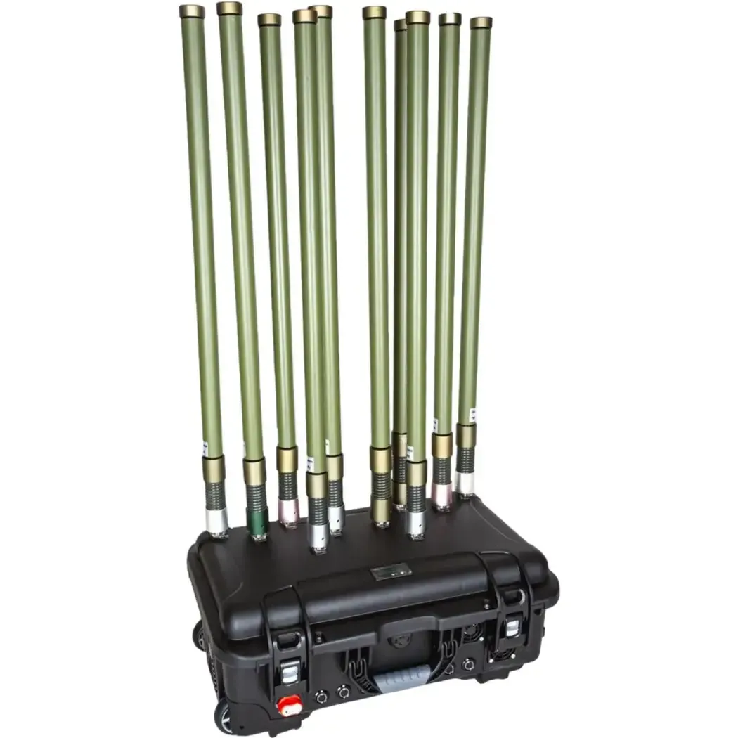 REB HYMO XXL ground configuration (HYMO XXL + 10 m remote control + external brackets for installing antennas at a distance of 2.5 meters from the portable device’s installation point). REB HYMO XXL transport configuration (HYMO XXL + 10 m remote control + brackets for installing antennas on a vehicle) Tactical and technical characteristics: • Device powered by a built-in Li-ion 70 Ampere-hour battery. • Allows continuous operation for about 90 minutes, due to protection against loss of battery voltage during discharge and active system cooling. • The device is equipped with omnidirectional antennas. • The readiness time of the complex for operation (when deployed on the ground without extending antennas and control panel) – 200 s. • Number of independent channels – 10 • Indication – presence of light indication of controls (LED charging indicator, backlight of channel start buttons). • Weight of the signal generation unit – no more than 25 kg. • Dimensions of the signal generation unit: 560 * 360 * 250 mm. • Degree of product protection IP55 according to DSTU IEC 60529:2019. • Active cooling system.