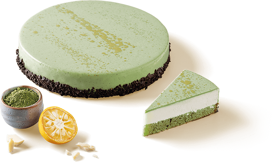 A delicate and vibrant dessert featuring a rich matcha tea base, complemented by a zesty lime and yuzu mousse. The entire creation is elegantly finished with a glossy matcha tea glaze, offering a harmonious blend of earthy, citrus, and sweet notes.