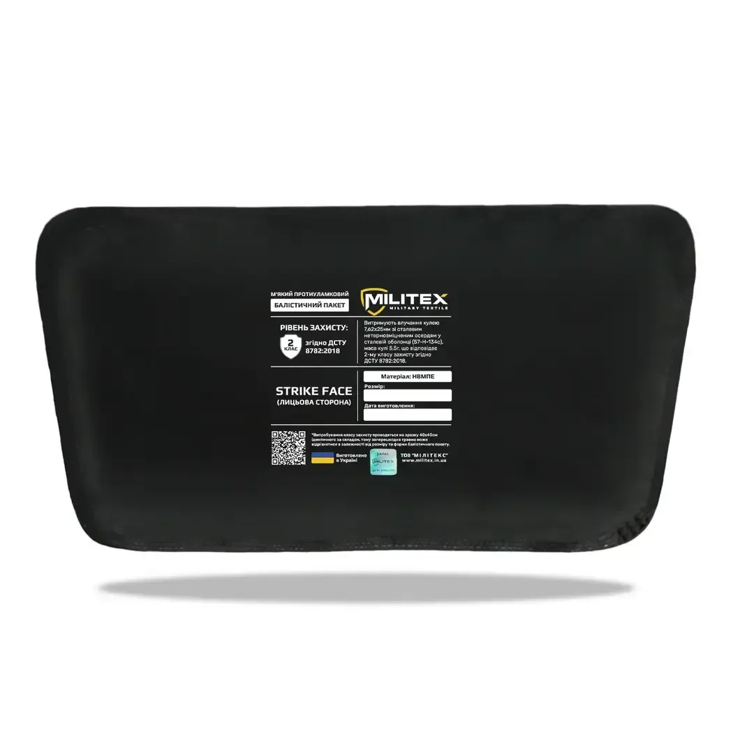 Militex ballistic packages (class 2) are soft, flexible, and lightweight panels for protection against pistol bullets, fragments, and secondary damaging elements.