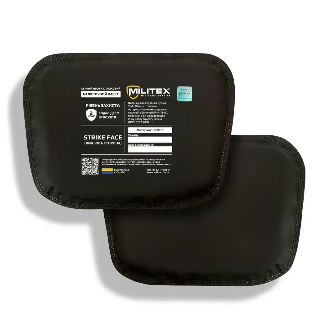 Militex ballistic packages (2nd class of protection) are soft and light panels for reliable protection against pistol bullets, fragments, and secondary damaging elements.