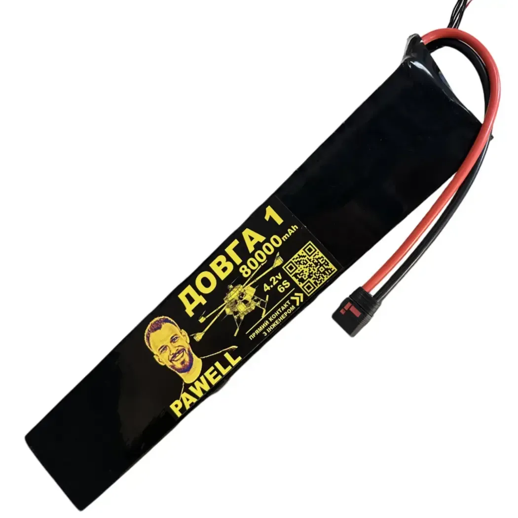 Long Battery 1, for Vampires, 80000 mAh. Roomy, shock-resistant battery with a charge indicator, suitable for all versions of VAMPYRs. Equipped with a handle, protective corners, and easily attaches with clamps. Weighs only 6.6 kg, has 21% more capacity than 66000, and is charged with a standard 25A charger.