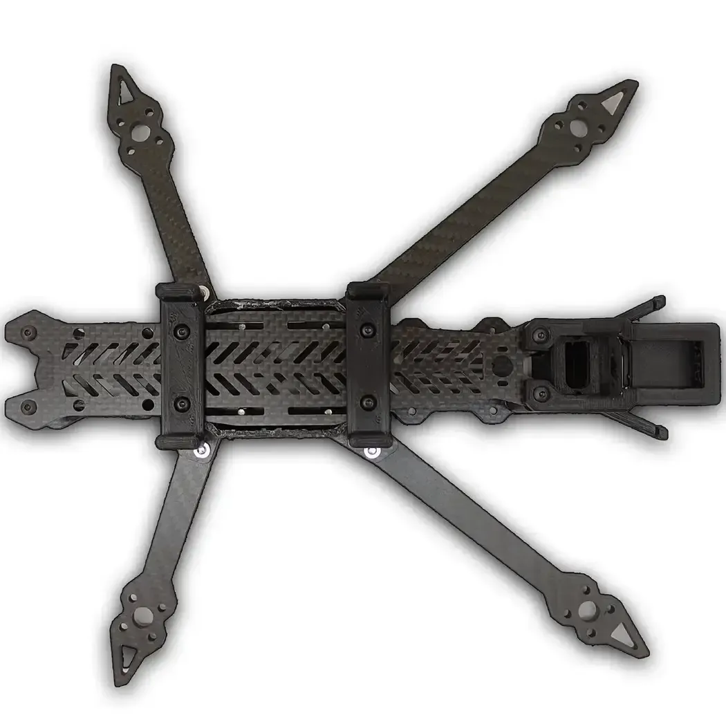 Carbon frame for FPV (First-Person View) quadcopter 5 inches for long-range and prolonged flights. The frame is designed and manufactured according to the DadCat (dead cat) aerodynamic scheme. This arrangement allows the front arms to be “moved back”, thanks to which the propellers of the front arms do not fall into the camera’s field of view. The enlarged “body” of the frame has more space for mounting additional equipment such as, for example: camera rotation mechanisms, additional radio communication elements, additional blocks for installing thermal cameras, video communication filters, amplifiers, converters, and other equipment. Also, the enlarged “body” of the frame allows the use of batteries of various form factors, as well as changing the centering of the copter for more energy-efficient flights with various payloads. The frame has a reinforced structure to reduce vibrations (body plate thickness 3mm, arm thickness 5mm). Комплектація (Equipment): 1) Carbon frame elements (body, camera mounting brackets, arms, and other elements); 2) Metal fasteners (standoffs and screws for mounting); 3) Plastic (flexible ElastanD100 plastic): – bracket for installing power connector, VTX antenna connector, receiver, and radio control antenna; – brackets for battery installation; – bracket for action camera installation; – protective side brackets; – bracket for GPS module installation. 4) XT60 power connector and 12AWG power cables for it; 5) Battery strap.