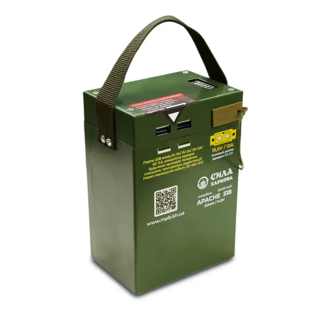 The Apache MPB-518 power bank has no equal on the market. This military power bank is the perfect combination of reliability and power that will provide you with electricity in any conditions. Thanks to four USB QuickCharge 3.0 outputs with different voltages, you can charge up to four devices simultaneously. But here’s where the Apache MPB-518 differs from others: its capacity at 18.5V is an impressive 28,000mAh, which is equivalent to 140,000mAh for ordinary civilian power banks at 3.7V. This means you get much more power for your equipment. Convenience is key for military personnel, and the Apache MPB-518 is no exception. With a USB Type C input/output and fast charging support, you can easily and quickly charge a variety of devices. Also, thanks to the DC 5.5*2.5 port, you can charge the power bank from any power source, from solar panels to a car adapter. The Apache MPB-518 also has Lightning and micro USB ports for fast charging your device. There is a CC-CV 20.8V / 10A power charging connector that allows you to charge the power bank from any power source using a suitable adapter. Also, using this port, you can connect an inverter to the power bank and get 220V at the output. The Apache-518 also has a residual charge indicator and an LED flashlight for working in the dark. An impressive aspect is the durable and reliable case of the Apache MPB-518, made of steel and covered with powder paint. This guarantees the highest level of protection against any damage and wear. The Apache MPB-518 is your reliable protector in the world of electronics on the battlefield. Keep your equipment always charged, even in the most extreme conditions.