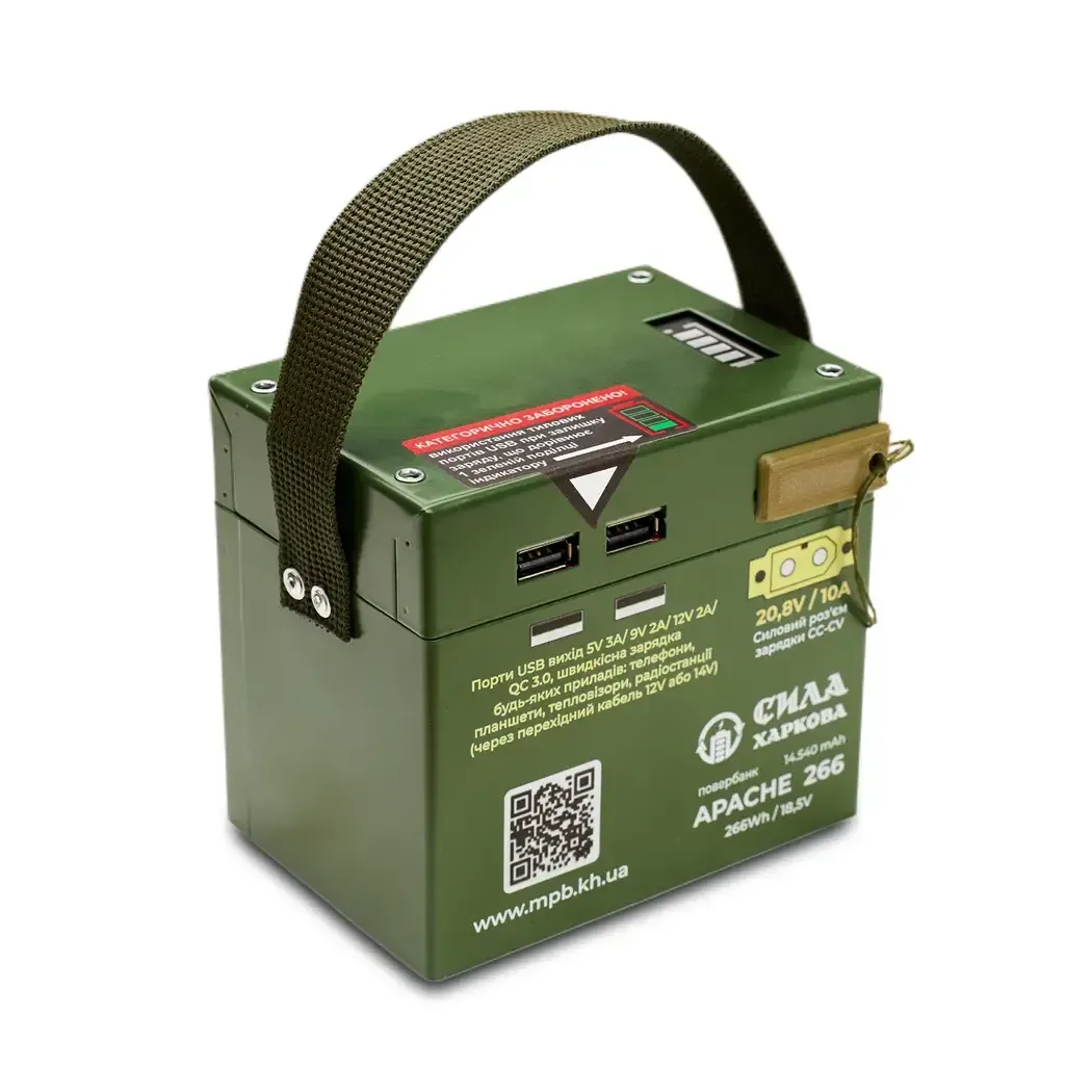 Power bank “Apache MPB-266” is an excellent choice for the military who need a reliable and powerful power source in any conditions. This power bank has a number of unique functions and features that ensure high efficiency and safety of use. In combat conditions, especially in remote or independent locations, access to electrical energy may be limited or completely absent. “Apache MPB-266” allows the military to provide power for communication devices, navigation systems, radio equipment, and other electronic devices that are vital in the process of performing combat missions. Thanks to two USB QuickCharge 3.0 outputs with different voltages – 5V-3A / 9V-2A / 12V-2A – you can charge several devices simultaneously. The power bank has a USB Type C input/output with support for charging devices at a speed of 5V-3A / 9V-3A / 12V-3A, which allows you to quickly charge compatible devices using this port. There is a CC-CV 20.8V / 10A power charging connector, which allows you to charge the power bank from any power source using the appropriate adapter. Power banks can be used to store electrical energy at remote locations of military units. They allow you to charge their internal batteries from any power source, such as a car adapter or a 220V network, and then use this energy to power electronics in the field. The power bank body is made of steel and painted with powder paint, which provides reliable protection against damage and wear. The power bank has a residual charge indicator that allows you to monitor the device’s charge level, as well as an LED flashlight that will help you in the dark. Thanks to high power, reliable protection and a wide range of supported devices, our “Apache MPB-266” is ready to become an indispensable companion for the military in any conditions. Safety, reliability and high performance – this is what makes our power bank an ideal choice for those who serve on the front line.