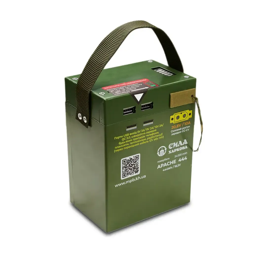 Military power bank Apache MPB-444 is a reliable and powerful device for charging your electronic devices in any conditions. Thanks to four USB QuickCharge 3.0 outputs with different voltages – 5V-3A / 9V-2A / 12V-2A – you can charge up to 4 devices simultaneously. The power bank has a USB Type C input/output with support for charging devices at 5V-3A / 9V-3A / 12V-3A / 15V-4A / 20V-5A, which allows you to quickly charge compatible devices using this port. With Apache MPB-444, you can charge drone batteries, laptops, thermal imagers, scopes, tablets, phones, and other important electronic devices. In addition, the DC 5.5*2.5 port with an input voltage of 5 to 12V allows you to charge the power bank from various power sources, such as solar panels, a car adapter, or a 220V network. The power bank also has Lightning and micro USB ports with fast charging support for charging devices that do not support USB Type C. There is a CC-CV 20.8V /10A power charging connector that allows you to charge the power bank from any power source using an appropriate adapter. The power bank body is made of steel and painted with powder paint, which provides reliable protection against damage and wear. The power bank has a residual charge indicator that allows you to monitor the charge level of the device, as well as an LED flashlight that will help you in the dark. The Apache-444 military power bank is a reliable and powerful device that will provide you with enough energy to charge important devices in any extreme conditions.