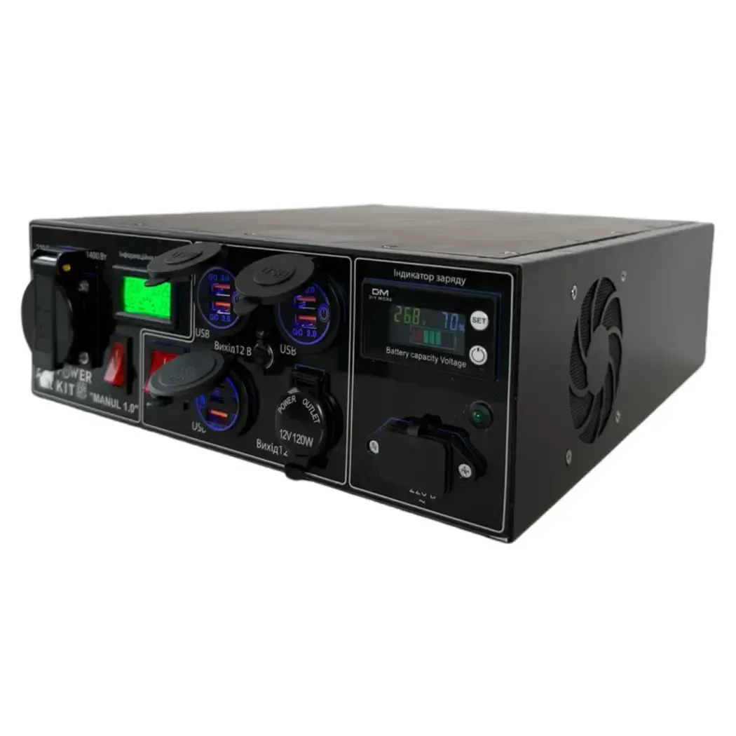 Kit: PowerKit Manul 1.0 charging station – 1 pc. Bag for moving and storing the kit – 1 pc. AC 220 V mains cable for charging, C13 standard, 1.5 m – 1 pc. USB extension cable 1.5 m – 1 pc. USB LED light bulb 5V/1W – 2 pcs. Specifications: Li-ion battery capacity – 1000 Wh Peak inverter power 220 V – 2000 W Continuous inverter power 220 V – 1000 W Frequency – 50 Hz (pure sine wave) 5.5*2.1 connector – 12 V (10A) Car socket – 12 V (10A) USB outputs – 7 pcs. USB – QC3.0 (6 pcs) USB Type-C – PowerDelivery Charge indicator C14 standard device charging connector – 220 V LED charge status indicator Full charging time ~ 4-5 hours Overall dimensions – 100*300*360 mm Weight 7.5 kg.