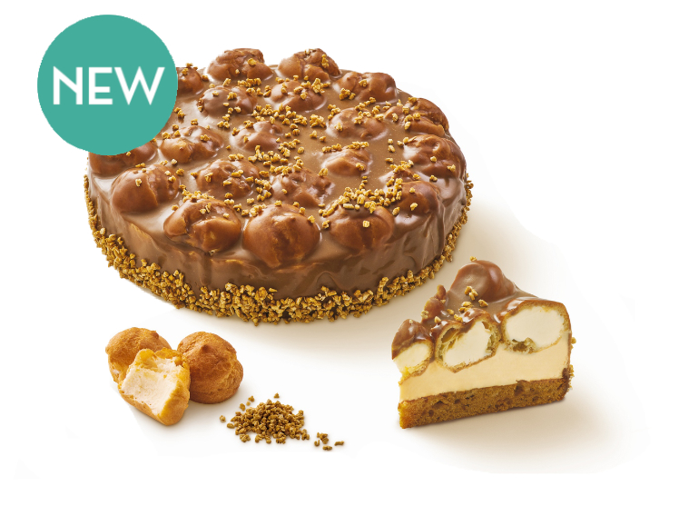 This round cake features a delightful caramel sponge, complemented by a crunchy croccante layer. It is generously filled with rich caramel and includes delicate profiteroles, all topped with a smooth caramel coating and garnished with crispy puffed rice.