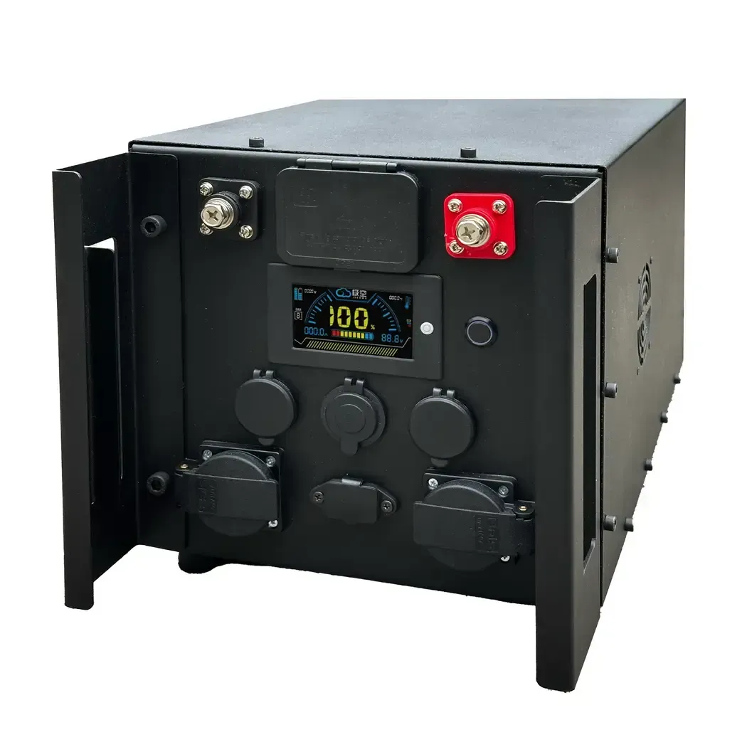 Portable charging station for electronic warfare. A reliable and powerful charging station with a 416 A/h (LiFePO4) battery provides autonomous power for your devices. Equipped with an inverter up to 2 kW, two 220 V outlets, USB-A ports (2 pcs.), USB-C (2 pcs.), a car lighter socket, and 12 V terminals. The built-in charger allows you to easily charge the station from the mains.