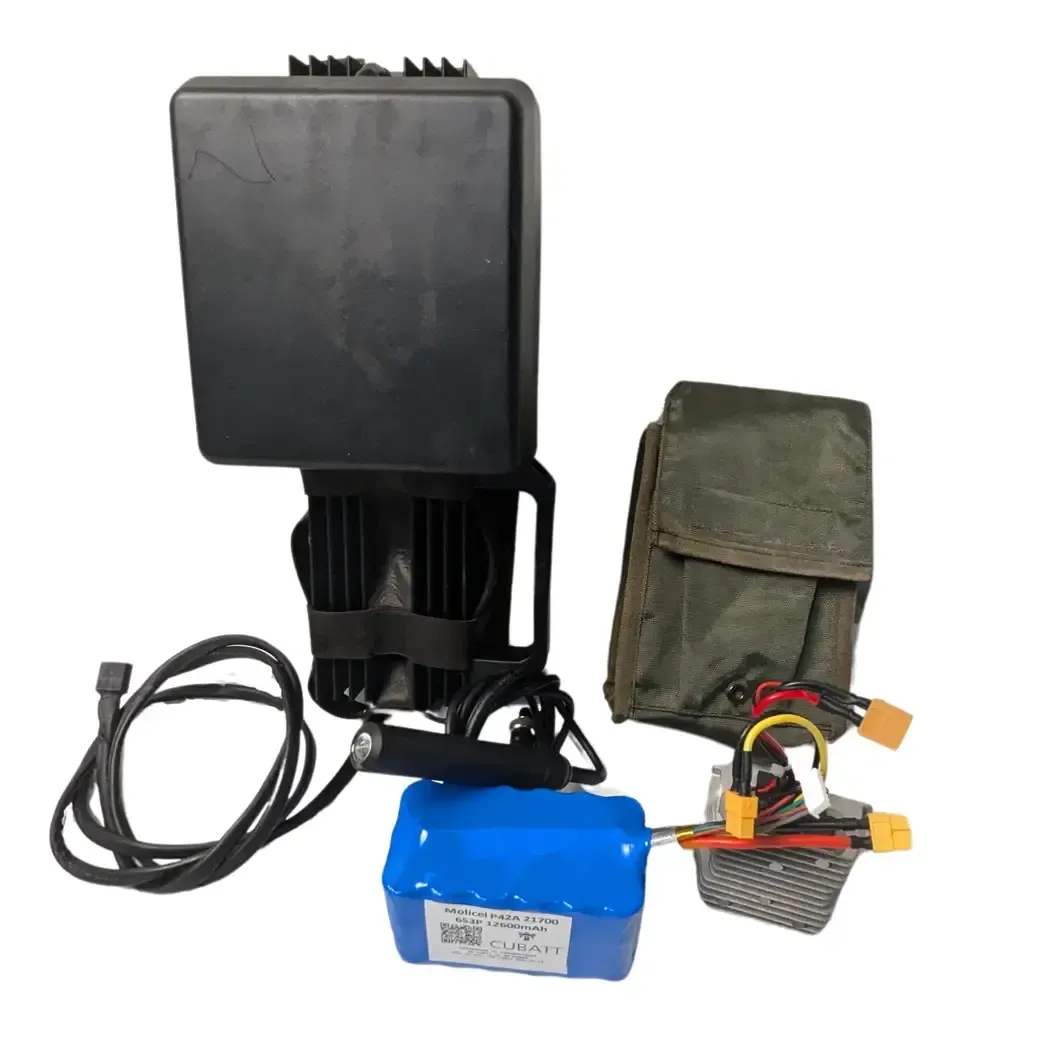 Infantry REB “Boryspil”, which effectively protects against FPV drones (700–1100 MHz) Technical characteristics: POWERFUL 100 W module LIGHT weight: only 2 kg (without battery), 3.3 kg with battery RELIABLE passive cooling that works in any conditions Suppression radius: 100 m Operating time: up to 40 minutes on one charge Effective directional patch antenna Equipment: REB “Boryspil” device 6S3P 12600mAh battery Battery bag.