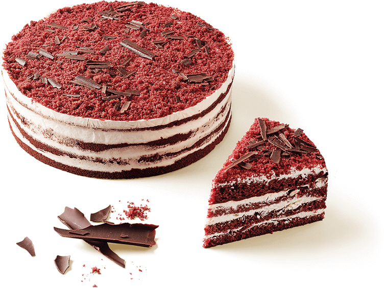 Excellent red velvet cake with great flavor and quality. Red velvet base, cream, milk chocolate ganache.