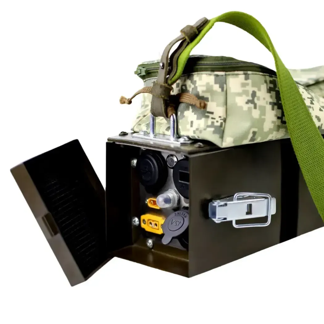 The Scat-260F military power bank is designed specifically for the needs of military personnel. It has a durable stainless steel body that can withstand significant loads and is protected from moisture. Among the unique features of the Scat-260F power bank is the ability to “jump-start” 12V car batteries, or instantly charge them using a power connector. With up to 180A on the terminals, the device can charge a discharged car battery in a minute or start a car up to 30 times. By connecting 2 devices in series, you can get a 24V network, which will allow you to start military equipment or perform emergency field welding with a 3 mm electrode for 10-20 minutes. The super-powerful current allows you to easily weld an anti-tank hedgehog or the suspension of an armored vehicle. Using the terminal clamps (crocodile clips) included in the kit, the power bank can be charged up to 50% from a regular car, whose generator produces 14.4V. And this is only in 15-20 minutes! Also, the Scat-260L power bank can be charged from a solar panel or a separate powerful 220V mains power supply in 1 hour up to 80%, which can be added to the complete set. Charging from solar panels and simultaneous use of the device is possible. The 12V power bank socket can distribute 1A to 10 devices simultaneously, and 2 sockets – to 20 devices, or 10 phones can be charged with a current of 2A – and this is not counting the built-in 4 USB outputs. The body is made of stainless steel and protected from moisture. This allows the power bank to be transported in extreme conditions and not be afraid of damage.