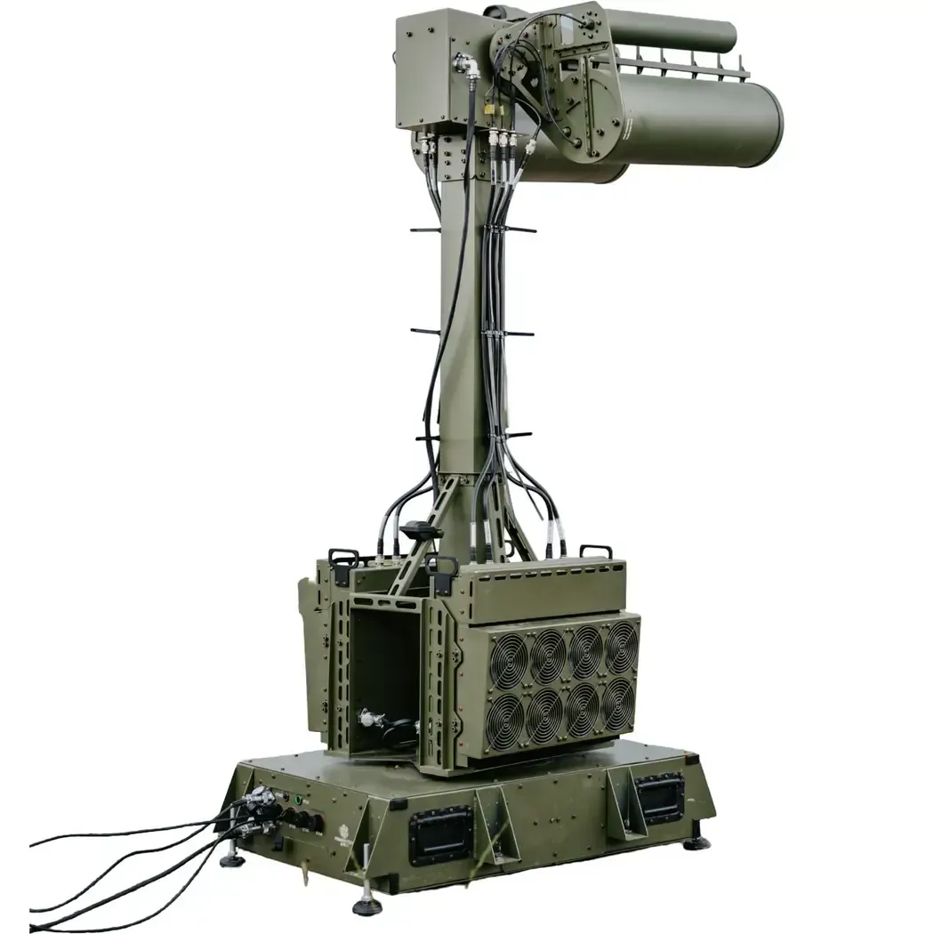 Stationary SPR system – designed to counteract all types of drones using radio interference. It successfully interferes with drone control, loss of radio signal, and geopositioning. SPR is a powerful electronic warfare system that can cause a drone to crash and can operate in automatic mode. Frequency ranges from 100 to 7000 MHz. Radio counteraction distance from 3-5 km. Moisture and impact protection allows it to be used in any weather conditions.