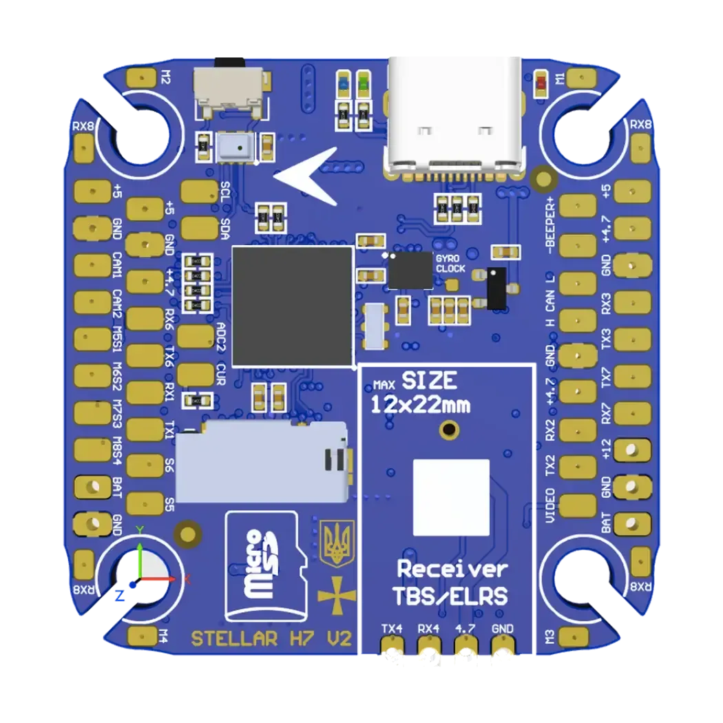 The Stingbee Stellar H7 V2 flight controller is equipped with a super-fast modern H7 processor, operating at 480MHz and 1MB of RAM! It has a built-in precise Infineon DPS310 barometer, an ICM42688p gyroscope with an external clock, a MicroSD slot and 128MB SPI NAND flash for logging, 7 UART ports, two BECs at 5V/2A and 12V/3A, and a CAN BUS port to support the connection of special peripheral devices.