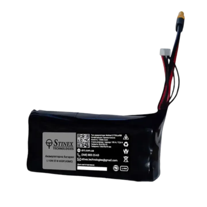 Battery for FPV drone ST-B 45MC(6s4p) – Li-ion battery pack 6S4P 18000mAh – is an ideal option for FPV drones, made from original Molicel INR21700-P45B cells. Characteristics: Capacity: 18000 mAh Voltage: 20.4-25.2 V Discharge current: up to 180A Battery type: Li-Ion Cells: Molicel INR21700-P45B Number of cycles: 500 charge cycles Charging current: 8.4A Weight: 2 Height 70 mm. Width 63 mm. Body color: black Features: Made on professional equipment using a 2 mm pure nickel strip to ensure reliable connections. AWG12 power wires and XT60 Amass connector guarantee stable connection and high performance. High current output and capacity ensure long flights and stable operation even under high loads. Positive qualities: Made from original high-quality Molicel cells to ensure durability and reliability. Ideal for FPV drones, providing reliable performance under heavy loads. Professional assembly with quality materials guarantees excellent performance and safety.