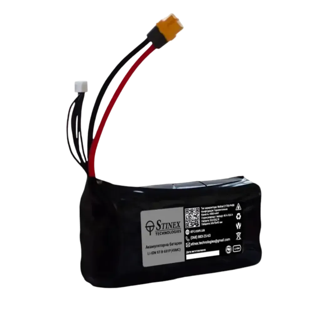 Battery for FPV drone ST-B 45MC(6s1p) – Li-ion battery pack 6S1P 4500mAh – this is an ideal option for FPV drones, made from original Molicel INR21700-P45B cells. With high capacity and discharge current. Characteristics: Capacity: 4500 mAh Voltage: 20.4-25.2 V Discharge current: 45A Battery type: Li-Ion Cells: Molicel INR21700-P45B Number of cycles: 500 charge cycles Charging current: 8.4A Weight: 450 g Dimensions: Length 65 mm, Height 75 mm, Width 43 mm. Configuration: Horizontal Housing color: black Features: Made on professional equipment using 2 mm pure nickel strip to ensure reliable connections. AWG12 power wires and XT60 Amass connector guarantee stable connection and high performance. High discharge current and capacity ensure long flights and stable operation even under high loads. Advantages: Made from original quality Molicel cells to ensure durability and reliability. Ideal for FPV drones, providing reliable performance under heavy loads. Professional assembly with quality materials guarantees excellent performance and safety.
