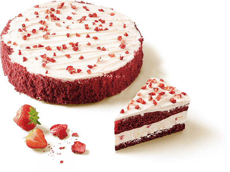 Excellent strawberry red velvet cake with great flavor and quality. Red velvet base, cream, strawberry filling.