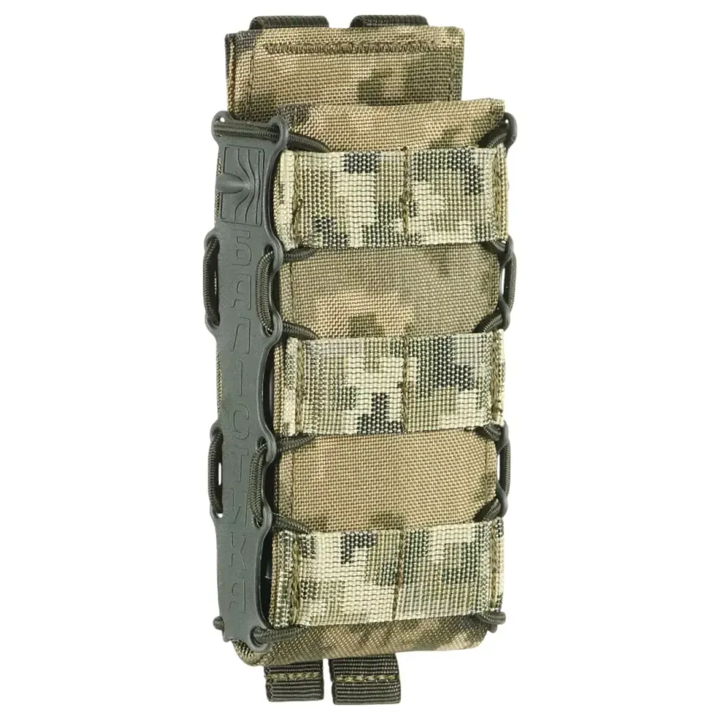 «Kolchan» is a pouch for AKM, AK-74, AR-15, AR-10 magazines, etc. Thanks to the patented polyamide side wall, it has reduced dimensions and weight (95 g). This allows you to easily place the required number of pouches next to each other. In addition, the magazines do not fall out thanks to reliable elastic elements and the design of the pouches themselves. Features of the pouch Quick-access magazine pouches «Kolchan» are distinguished by a number of unique features: Rigid side walls are made of plastic as a separate element and have an optimal size so that you can carry three or four pouches right next to each other (depending on the size of the plate carrier or body armor). That is, the plastic elements do not protrude beyond the MOLLE cells into which the pouch is laced, and therefore it does not conflict with adjacent ones. Side walls and high-quality elastic do not allow magazines to fall out under load and during movement, so «Kolchan» does not require additional fixation. But for skydiving, the «Ballistics» company still recommends using fixators. Thanks to the possibility of untying the elastic band and adjusting its tension, each shooter can choose the optimal fixation stiffness for the magazine. Open access to the magazine allows for quick reloading of weapons – the pouch is equally well suited for magazines from AK-47, AKM, AK74, AR and similar. It works great with magazines containing .308 (7.62×51) caliber cartridges. Thanks to the same rigid walls, the pouch can also be used as a holster for pistols such as PM, Fort and similar. The front panel has a MOLLE system, which allows you to attach other pouches (for example, for AK, for short-barreled weapons or for a grenade, a magazine dump pouch). The back wall is higher than the front, which allows you to quickly, almost blindly insert the magazine and, in fact, place quivers on top of each other to create double pouches. Specifications Material: Cordura 500D1000D. Wall material: polyamide. Inner part: molded plastic. Weight: 95 g. Dimensions: Width: 7.5 cm. Thickness: 3 cm. Front wall height: 14 cm. Back wall height: 16 cm.