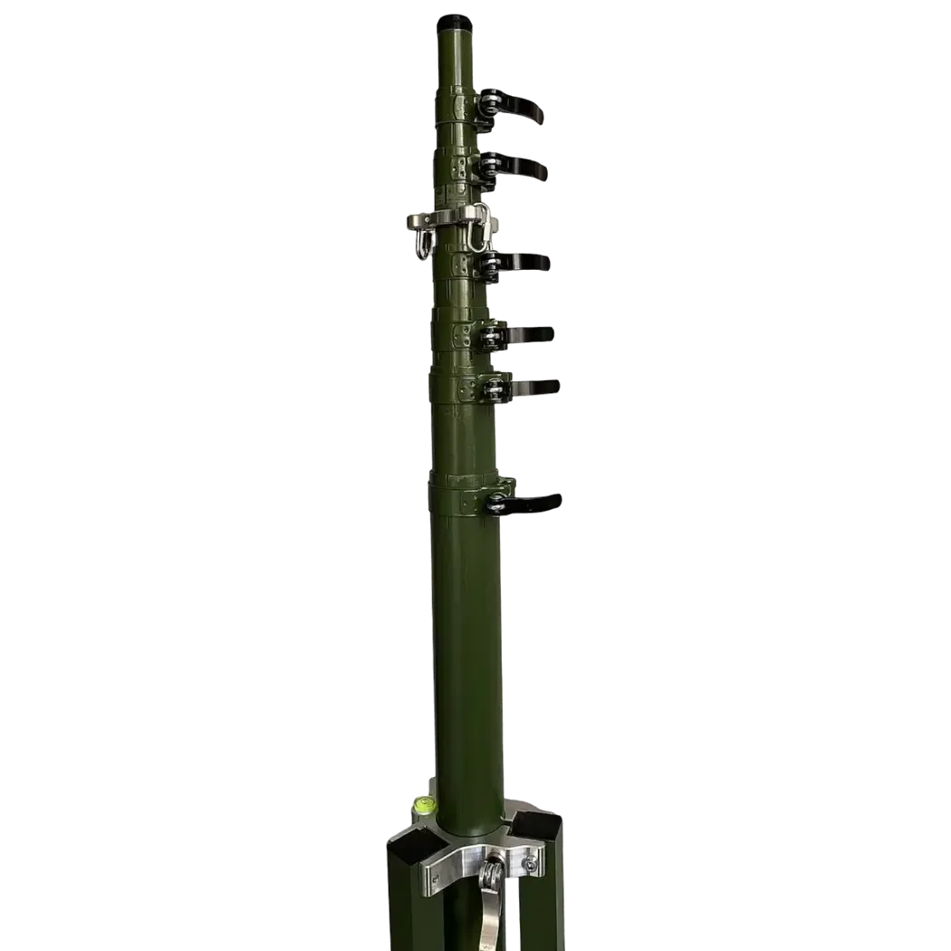 The “Air3F” telescopic mast is made of aluminum and coated with khaki powder paint, which ensures its resistance to corrosion and wear. The mast weighs 16 kg, and the maximum deployment height is up to 9 meters. When folded, the mast height is 188 cm, which ensures convenient transportation and storage.