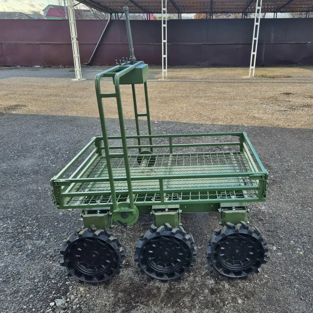 NRK “Tesla” is an unmanned ground (robotic) complex, 6 wheels, each wheel has its own engine and independent suspension, high cross-country ability. Quickly replaceable battery. Maintainability. Possibility of installing additional equipment: cameras, thermal imager/night vision, communications, etc. NRK Tesla performed well with a mounted turret and a PKT 7.62 machine gun. Ease of use: size for the body of any pickup truck, unloading/loading by three people. Production flexibility allows adapting the NRK to specific needs.