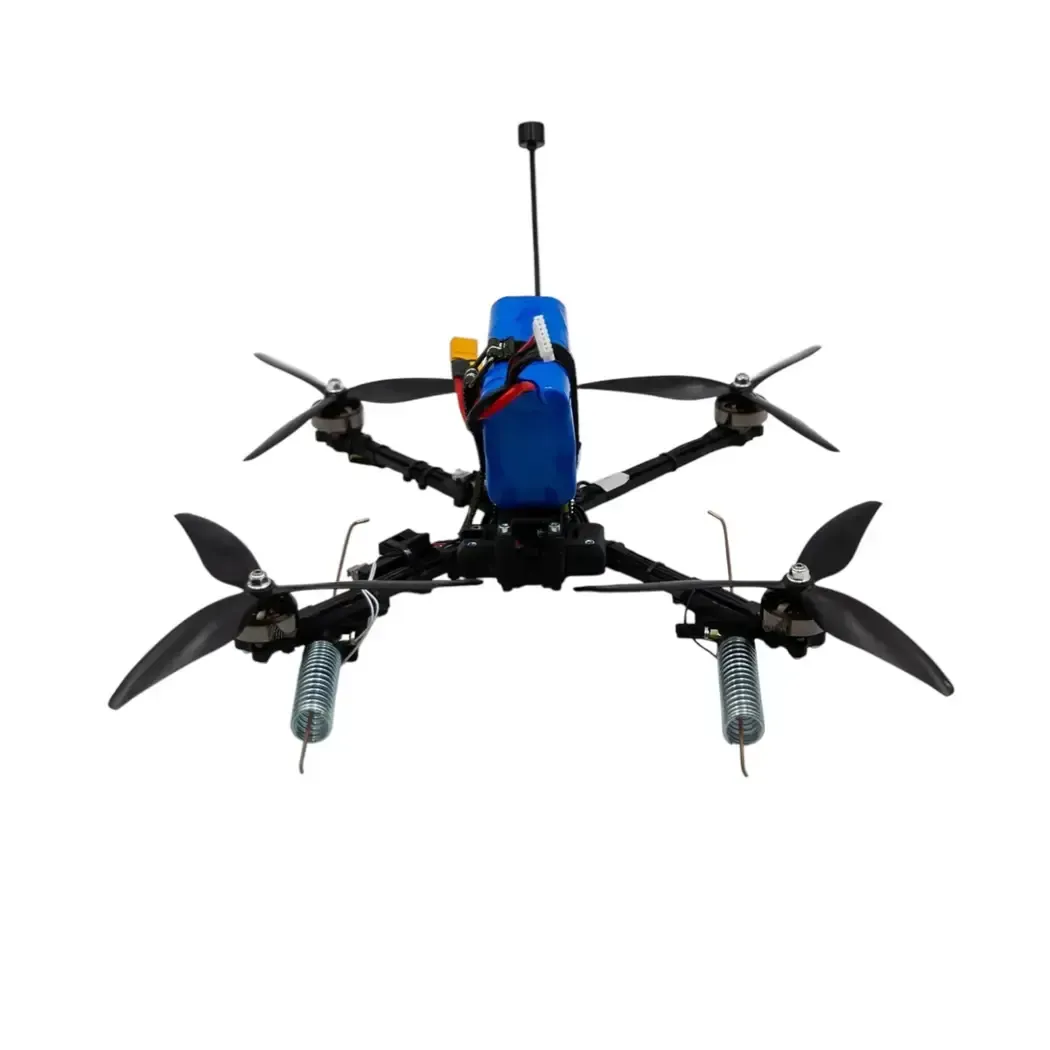 Drone on an 8” carbon frame. It is the most universal solution for working on targets in the range of 4 to 20 km. Payload up to 2 kg. Equipped with a light-sensitive camera for working in twilight, and an in-house developed initiation system. The BC initiation system has three degrees of protection and has earned the trust of crews due to its convenient design and stable operation.