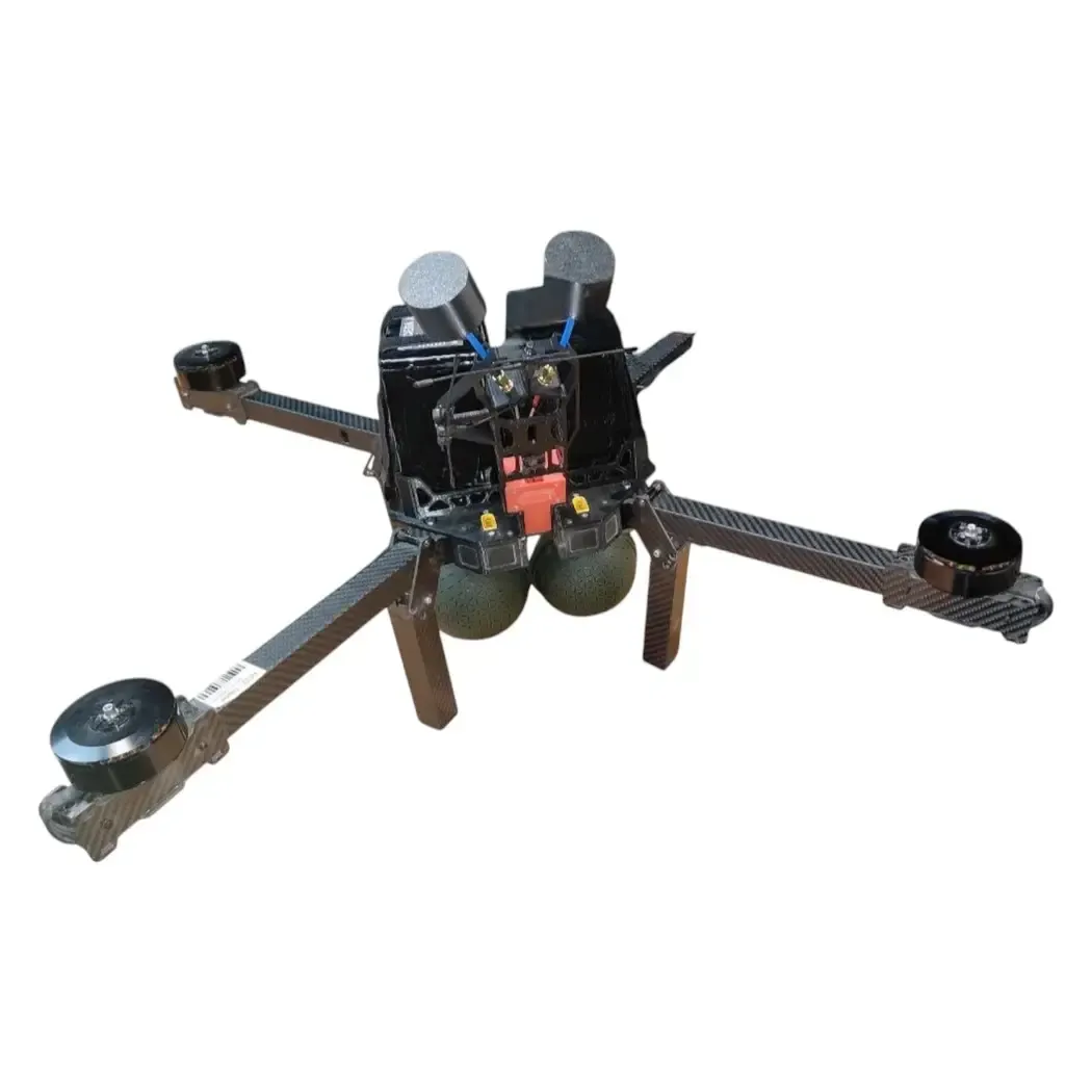 Bomber quadcopter with high combat characteristics combined with reasonable cost. Optical stabilization allows working from heights of 300+ meters in the daytime and 100+ meters in the night version (night version supplied separately). BK weight 7 kg – Range (distance with return) 15 km BK weight 5 kg – Range (distance with return) 20 km Flight altitude 1000 m, working 150-350 m