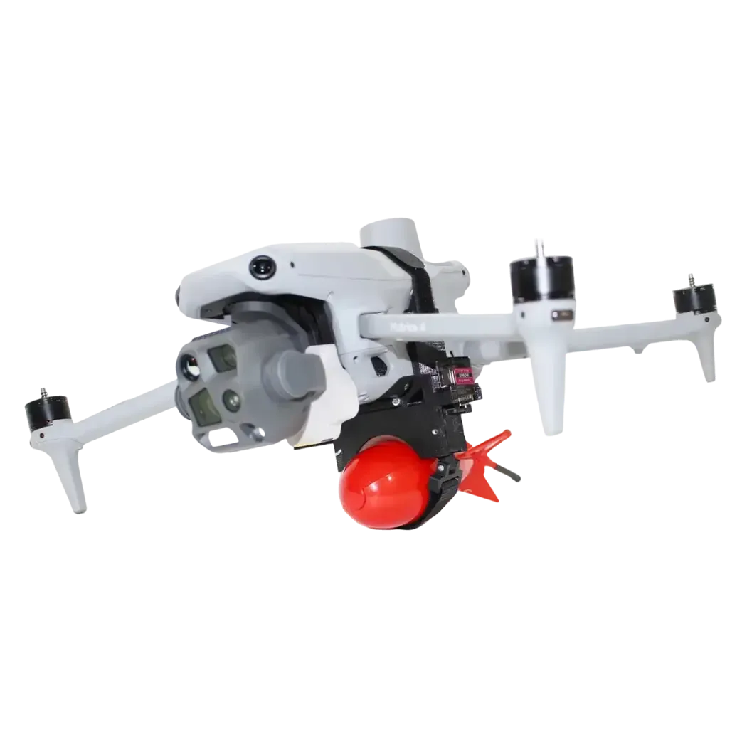 Autonomous system for transporting and dropping various payloads on DJI MATRICE 4T. The system is an autonomous suspended equipment for the drone, has autonomous power and works by reading light signals from the drone using a photo element. Thanks to this design, the system does not require interference with the drone’s architecture for its operation. The use of the system does not require switching off the lower position sensors when operating the drone.