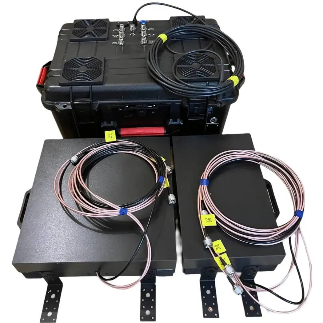 Portable radio-electronic means of countering unmanned aerial vehicles Anti-drone system “Zavada 2MAX” for directed suppression of radio control and video transmission channels of aircraft in the frequency range (according to customer’s specifications, others can be equipped): 830-950 MHz; 1400-1600 MHz; 2380-2520 MHz; 3300-3420 MHz; 5150-5340 MHz; 5390-5590 MHz; 5750-5850 MHz; The device is installed on: surface/transport. Effective range: up to 500 m (depending on application conditions). Power supply: built-in battery 29.4 V, 90 A-h or 24 V (34A) DC source, or 220 V AC source. Jamming power: 7 channels of 30(40) W each. Continuous operation time from 24V: not less than 23 hours. Operation time from built-in battery: not less than 160 min. Device weight equipped with antennas: not more than 35 kg. Antennas: patch (directional). Simultaneous operation from 220V and battery charging, 10 m long cable with manual control switch
